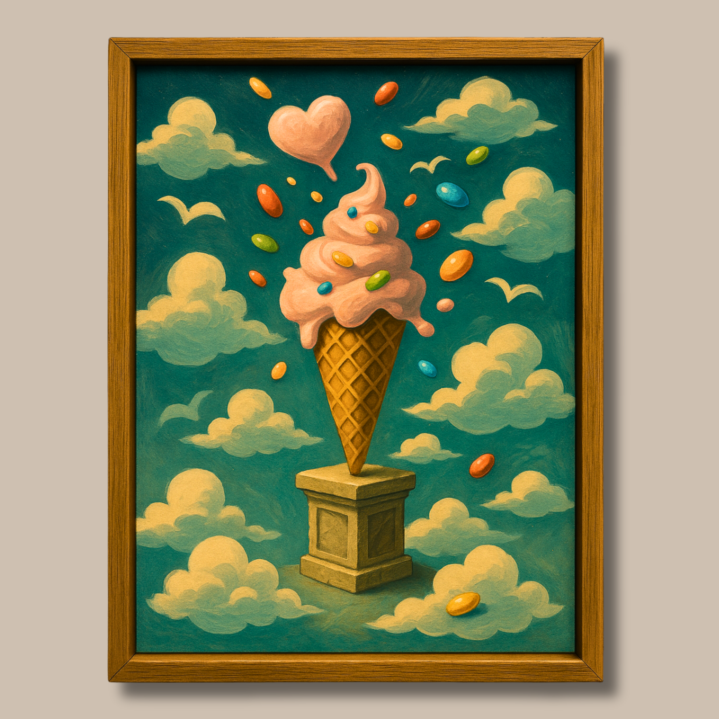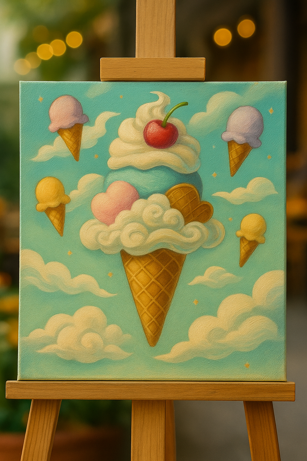 Sundae that floats like a daydream: soft pastel colors, flying ice cream cones, clouds that turn into cream, delicately melting elements that tip over into the absurd.