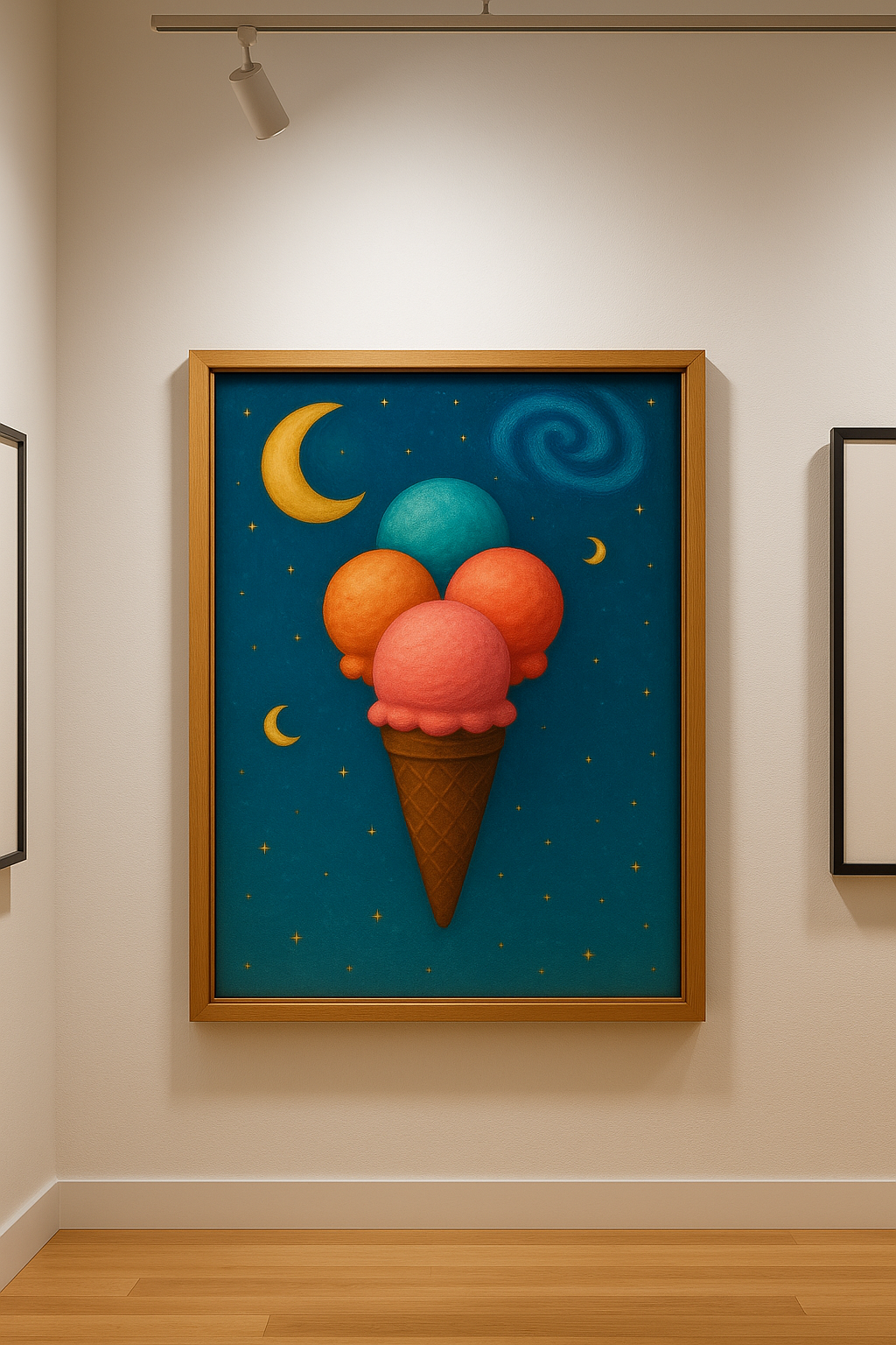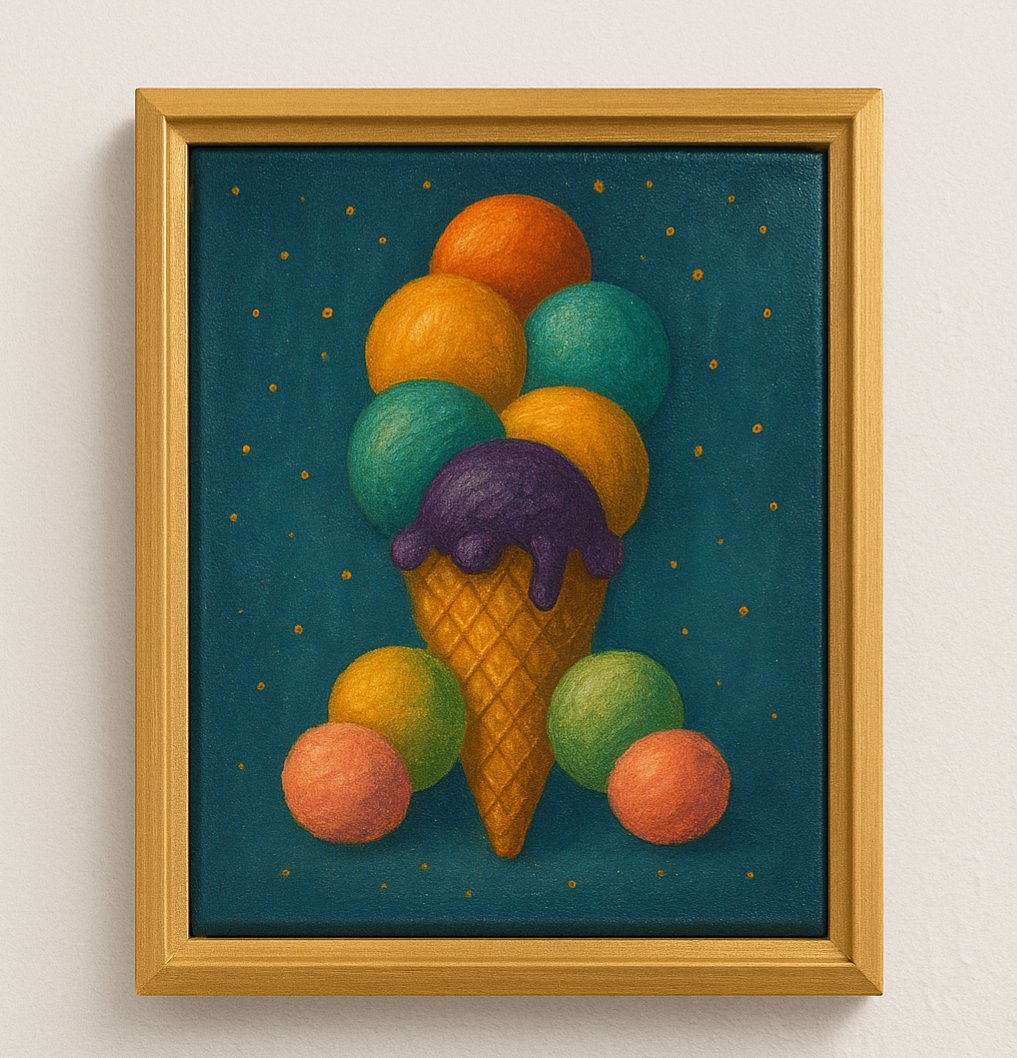 A joyful tower of glowing gelato scoops with rich violet topping. Vibrant, playful & impossible to resist.