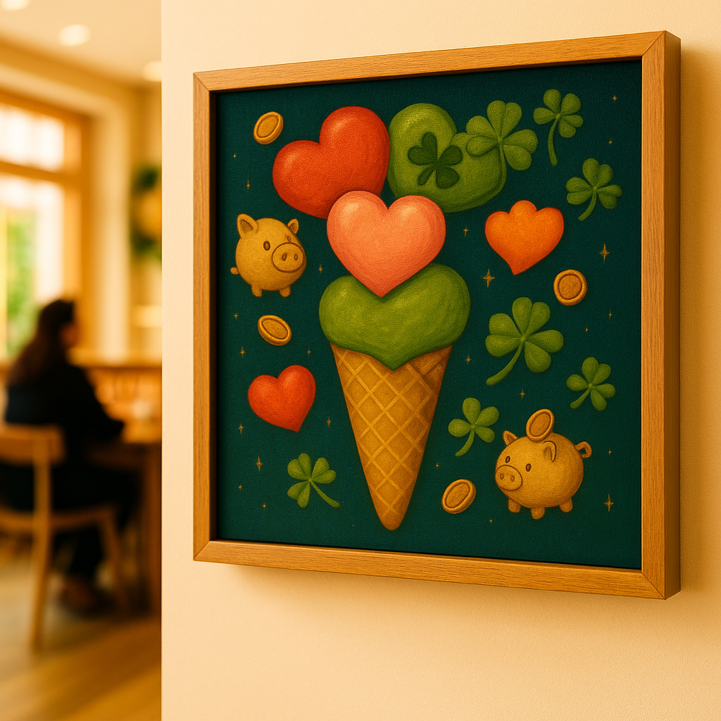 With shamrock, piggy bank & hidden happiness: ice cream meets absurd lucky charms.